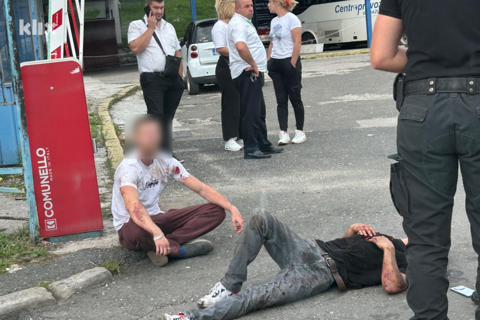 Na fotografijama je vidljivo da jedan muškarac leži na tlu u krugu autobuske stanice dok drugi muškarac sjedi na tlu. Obojica na sebi imaju tragove krvi.